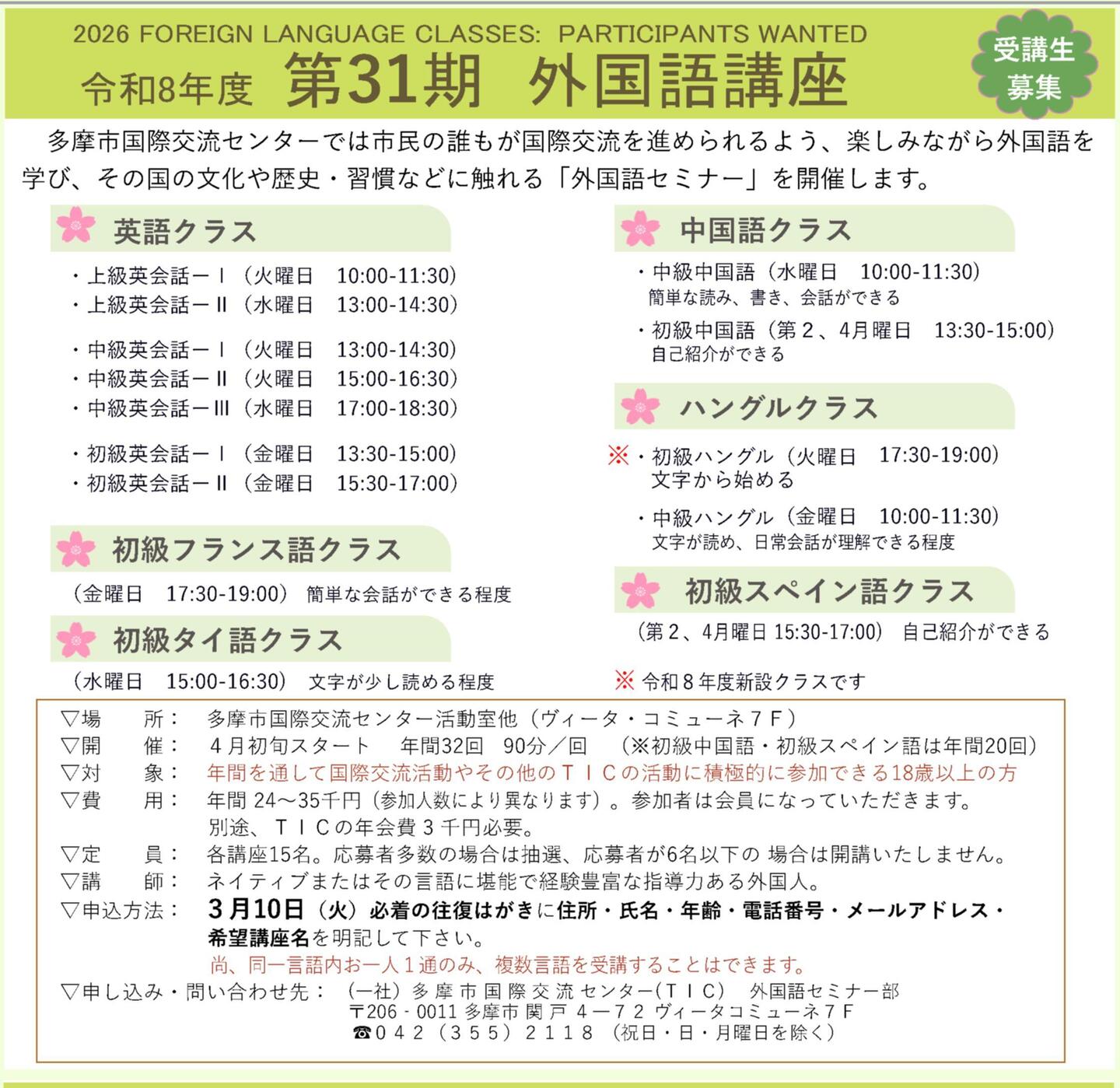 . メンバー募集 TICでは外国人への防災情報の提供や、いざという時にどうすべきかなど、外国人が地震や洪水が起こった時、できるだけ自分や家族の安全を図れるよう、様々なサポートを考えています。詳細はこちら ENGLISH SALON 自主的に楽しく英語を勉強するサロンです。詳細はこちら【日時】・2026年2月10日(月) 10:00~11:30【テーマ】Why has English became the world's common language? 国際交流活動に関心を持って、少し活躍できる場をみつけてみませんか? 詳細は< こちら> またはQRコードをアクセスして下さい ボランティア募集! ユース国際交流部の担当の一つとして、外国人児童(多摩市立小・中学校の生徒)の適応指導のボランティアがあります。外国人児童は増えつつあります。希望者を募ります。ぜひTIC事務局にご連絡ください。