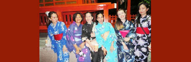 多聖蹟桜ヶ丘駅から徒歩6分のところにある、由緒ある一ノ宮小野神社の盆踊りに参加します。外国人はTICで浴衣を着つけてもらい盆踊りに参加します。浴衣を持っていない外国人希望者にはTICが浴衣を用意しています。