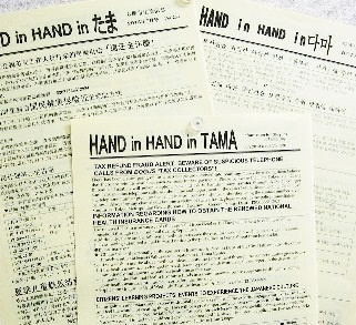 「HAND in HAND in たま」外国人のための生活情報誌です。主に多摩市の広報から、外国人に必要と思われる生活情報をピックアップしてのせている。