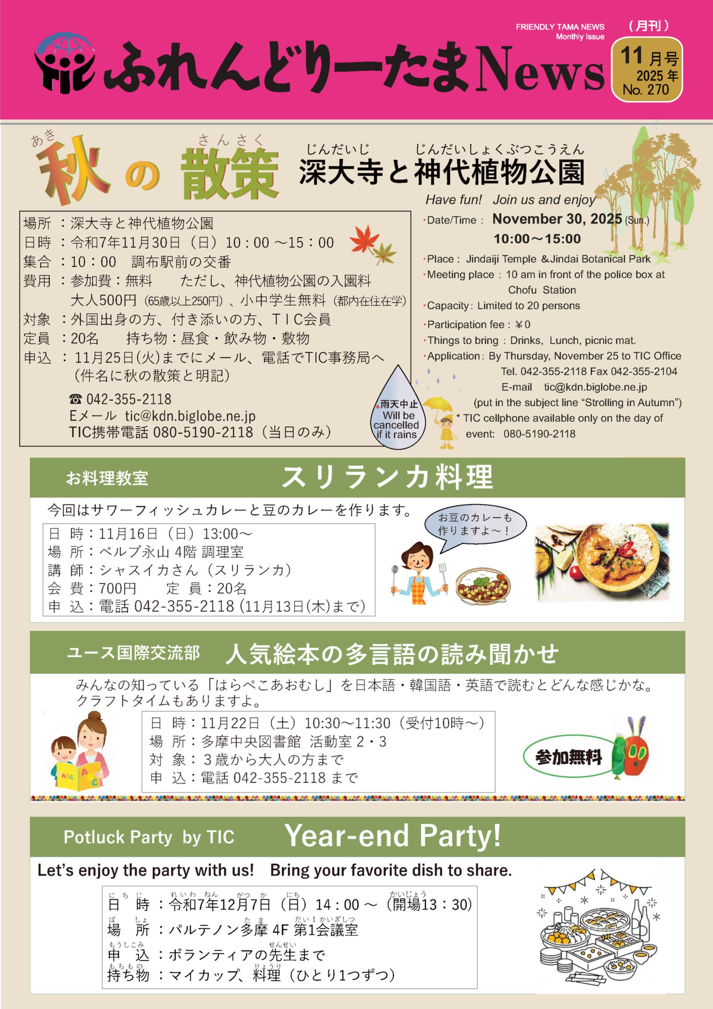 主にTICの最新のイベント予定、“日本語教室”“外国人相談”“生け花サロン”などの定期の活動、現在進行中のプロジェクトの経過などを掲載