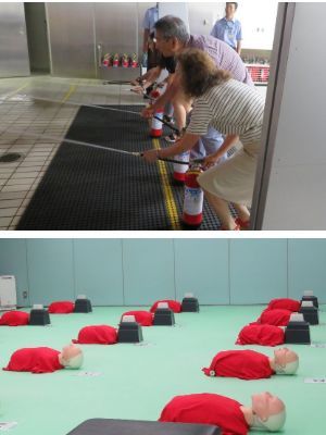 午後は消火器訓練から。係の方の説明の後,火の燃え盛るスクリーンに向け「火事だ!」と叫んで火をめがけて消火器の水をかけます。