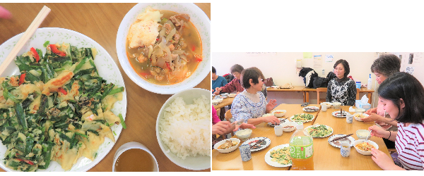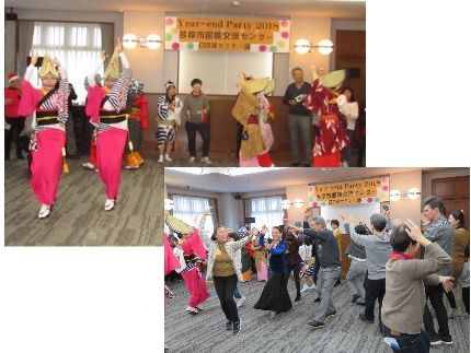 日本語教室5クラスの学習者とボランティア、また他の専門部からの会員が参加。市からも市長はじめ、岩永市議会議長、大野議員、担当部の松尾部長、立花課長、古谷副参事など8人の方にご出席をいただいた。学習者が持ち寄った様々な国の料理と日本料理が並ぶテーブルでは、歓談が弾み1時間もあっという間。後半はクラス別に歌やクイズで楽しんだ。中国の方の笛の演奏、ジャマイカの方の独唱、さらに「阿波踊り」「炭坑節」の2つの踊りにはそのクラス以外に会場から参加者があり、大いに盛り上がったパーティ―だった。