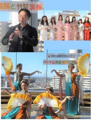 午後のイベントは一転して桜の花模様の桜ケ丘商店連合会の法被を身に着け、国旗を担いで入場。映像を使用しアフリカのガボン、チェコ、スロベニアの三国を紹介。続いてダ・バンプのヒット曲「USA」やソーラン節のダンスを披露。会場も手拍子で盛り上がりました。日本文化の紹介はお箏と尺八で「六段」と「春の海」の演奏。