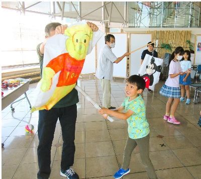 お手玉、けん玉、コマ、あやとり、紙風船と用意した中で、子どもたちが楽しく遊んだのは紙風船。お手玉、コマやけん玉はちょっと難しかったようでした。中国のジェンズを足で蹴るのは超難しいわざ。お菓子の入ったピニャータは思いのほか頑丈でなかなか割れませんでしたが、最後にはお菓子をゲット。叩き過ぎて中のおせんべいが割れてしまいました。