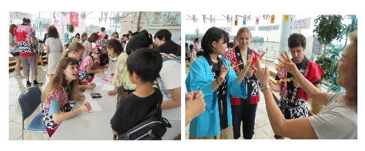 「ワールドキャンパス(WCI)」の外国の方々16人との交流会。WCIのメンバーからはそれぞれの国のクイズ、日本側として紙芝居と日本舞踊を紹介しました。恒例のWCIのソーラン節の後は会場の皆さんとの交流会で、おりがみや紙風船で遊んだり、カードにWCIのメンバーがイラストを描いてくれたり、皆が笑顔の楽しい国際交流でした。