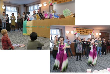 懐かしい顔もあり、おしゃべりに花が咲きます。後半は各クラスが勉強の合間を縫って練習した出し物。多摩センタークラスの歌「雪山賛歌」の英語の歌詞は皆さんおなじみの「愛しのクレメンタイン」そして中国語はなんと「新年好」で始まるお正月の歌でした。続く土曜クラスはフラダンス。他のクラスの外国人も音楽に合わせて、即興のダンサーになって踊りました。永山クラスは外国人がセリフを言いボランティアは絵の登場人物を動かして「大きなかぶ」の劇を。木曜夜は楽しいクイズに景品も出ました。