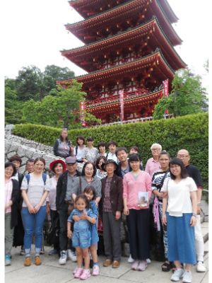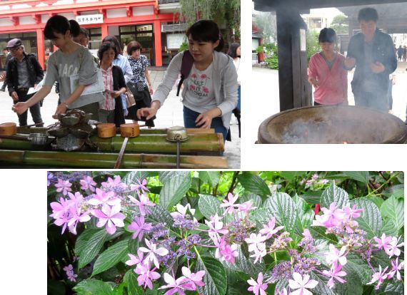 外国人6名(ベトナム、フィリピン、アメリカ、中国)を含む総勢23人で高幡不動を訪れました。歴史を感じる仁王門を入り、手水舎で身を清め、お参りをしてきらびやかな五重塔の横道から紫陽花の咲く道へ。