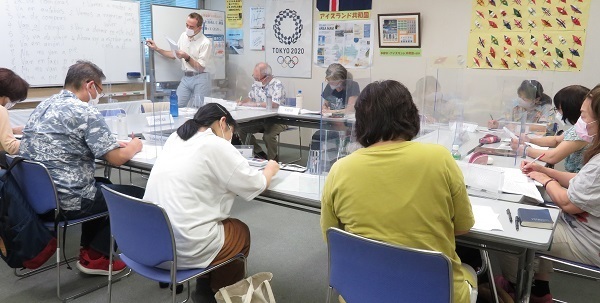 挨拶や、ひらがな、カタカナと基本の学習ですが、先生の言うとおりに声をそろえて練習しています。隣の人との練習の会話も楽しそうです。ひらがなを書くこともだんだん上手になってきました。高校生以下の子供さんも3,4人います。先生やスタッフへの挨拶も自然に日本語で出来るようになりました。7月は5回の授業があったので、皆さんお互いに顔見知りになり、なんとなくおしゃべりもしています。(日本語じゃないようでもありますが)残りの5回のクラスが終わるころには、どのくらい上達しているか楽しみです。