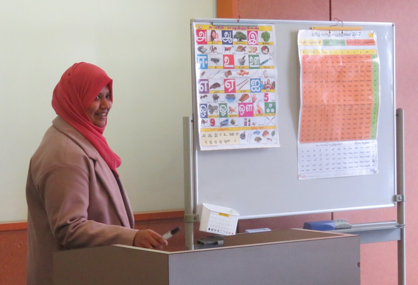 午後1時から、ベトナム語(講師:ベトナム出身のファムさん)とタミル語(講師:インド出身のベガムさん)の講座を行いました。ベトナム語には20名、タミル語には11名の参加がありました。どちらの言語も初めて触れる方が多く、皆さんクイズ感覚で新しい言語に挑戦していました。ベトナム語では自分の名前の言い方を覚えたり、タミル語ではあいさつの言葉を習ったりと、どちらの講座も楽しそうな雰囲気でした。